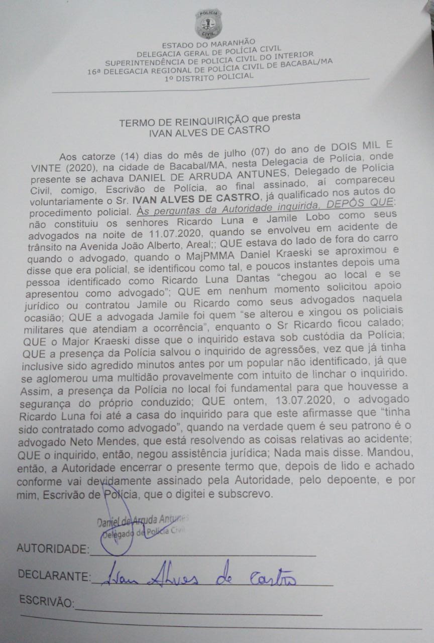 Um depoimento prestado na delegacia do 1º DP de Bacabal e conseguido por este Blog, provoca uma reviravolta no caso que envolve policiais militares e dois advogados da cidade.O depoimento, tomado pelo delegado de polícia civil Daniel de Arruda Antunes, foi prestado na tarde do dia 14 de julho pelo homem que deu início a toda confusão. Ivan Alves de Castro é o homem que conduzia uma Hilux na tarde do dia 11 de julho quando se envolveu num acidente de trânsito com uma motocicleta.