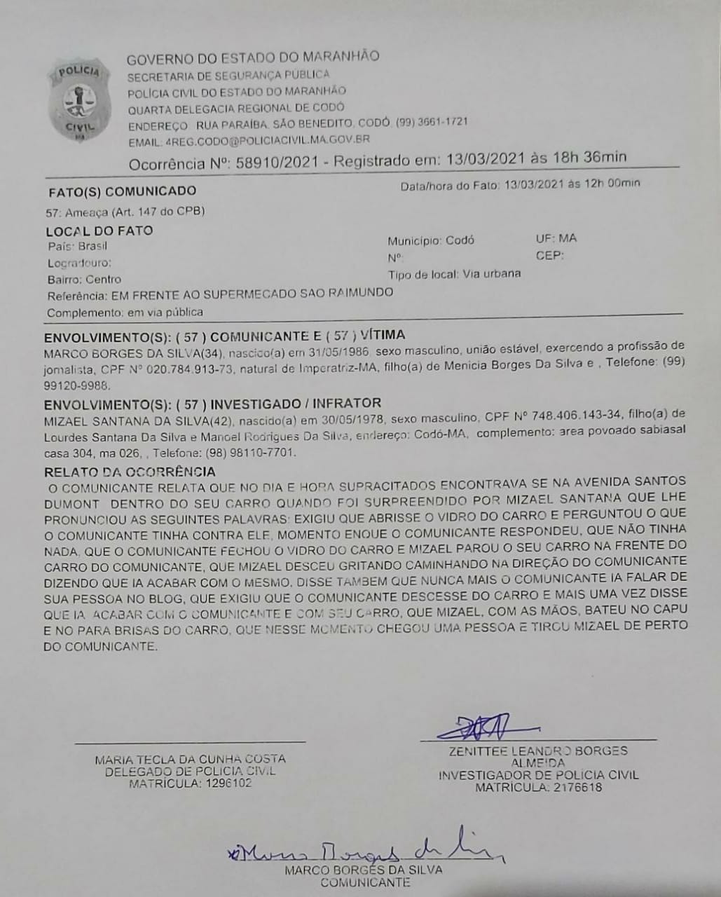 Apesar de saber dos riscos que envolvem minha profissão, eu particularmente nunca imaginei que pudesse ser ameaçado e quase agredido em plena via pública. Um ataque covarde que sofri de um servidor público municipal, que foi agraciado com um cargo comissionado e recebe salário de R$ 3,2 mil por mês do governo do atual prefeito de Codó, Dr. Zé Francisco.