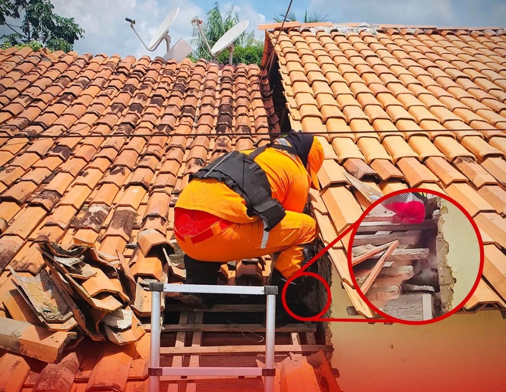 Com cautela, os bombeiros subiram no telhado e realizam o resgate do bichano com sucesso, protegendo a integridade física do animal.
