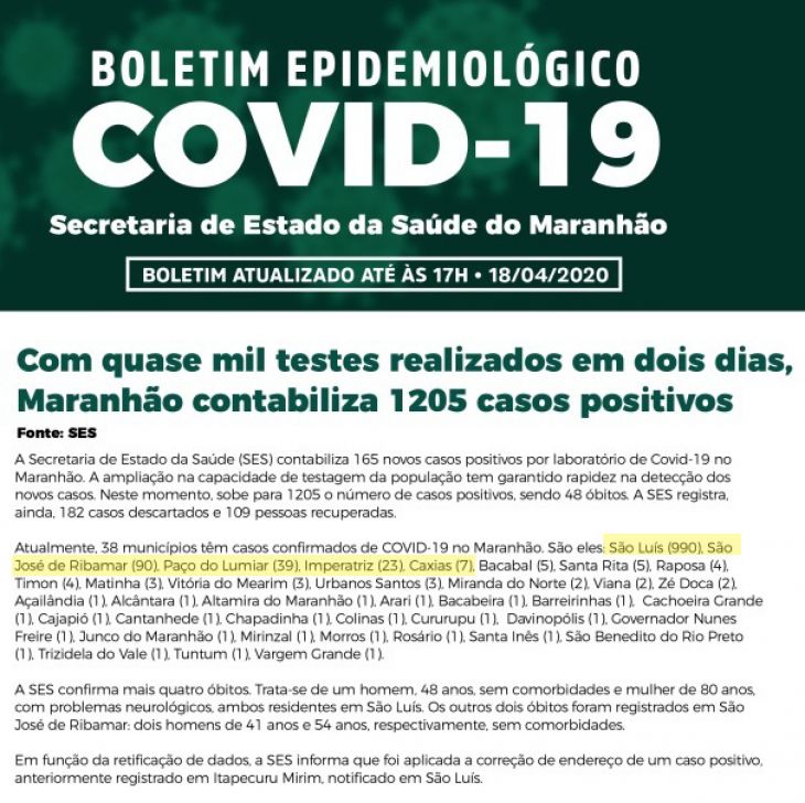 Caxias está entre as cinco cidades com mais casos de coronavírus no Maranhão, conforme dados divulgados pela Secretaria de Estado da Saúde (SES), no início da noite desse sábado (18).