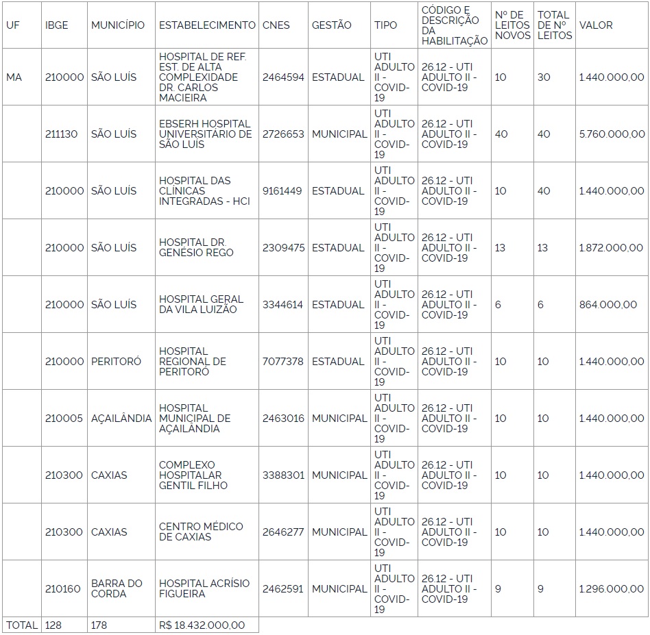 De acordo com a Portaria N° 1.240, de 18 de maio, cinco municípios estão habilitados: São Luís, Peritoró, Caxias, Açailândia e Barra do Corda. Serão 128 novos leitos, que serão usados para o tratamento de pacientes infectados pelo Covid-19.