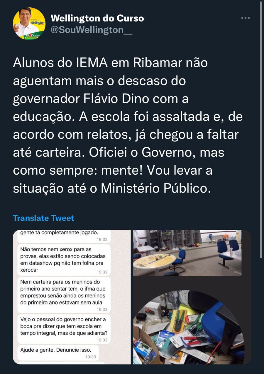 O deputado estadual Wellington do Curso utilizou as redes sociais para fazer mais uma denúncia sobre a realidade da educação pública no estado do Maranhão. Dessa vez, trata-se de uma demanda dos alunos da escola de tempo integral, IEMA, localizado em São José de Ribamar, que segundo denúncias, além de ter sido assaltado na última terça (15/03), não possui sequer cadeiras escolares suficientes e materiais básicos como papel para impressão de provas, por exemplo.