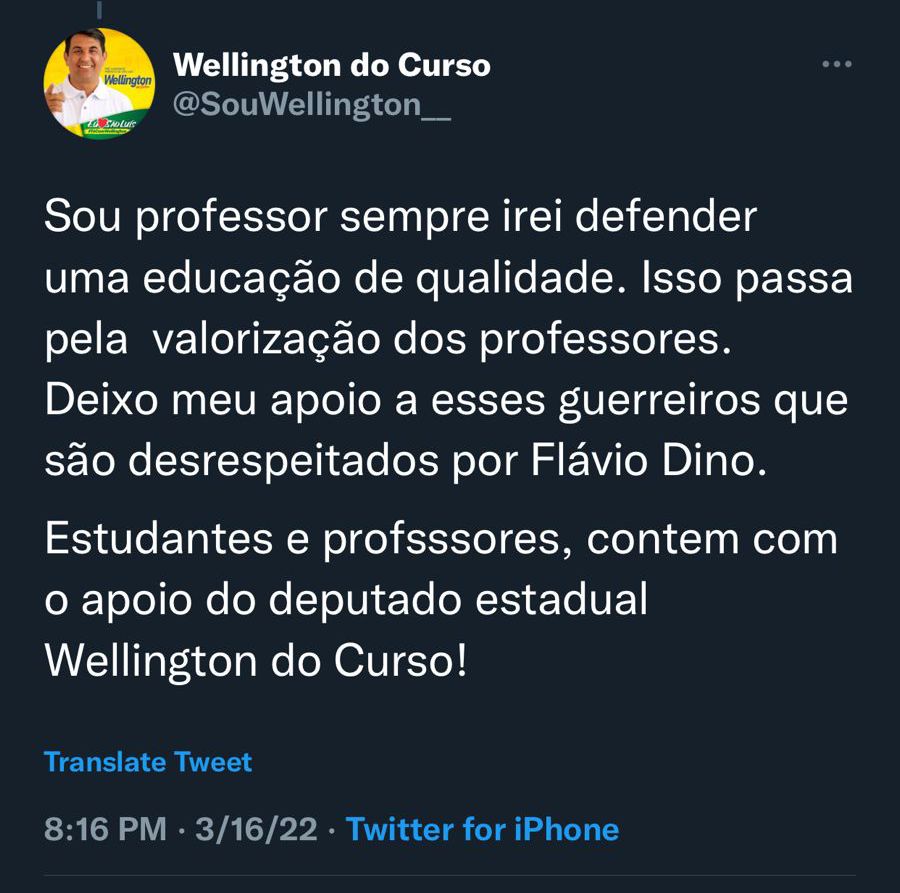 “Os alunos do IEMA em Ribamar não aguentam mais o descaso do governador Flávio Dino com a educação e ontem protestaram na frente da escola após o roubo ocorrido na escola. De acordo com os próprios alunos, a escola foi assaltada e, de acordo com relatos, materiais e equipamentos foram levados. Além disso, no IEMA de Ribamar, ja chegou a faltar até carteira e papel para imprimir provas para os alunos. Oficiei o Governo e iremos solicitar esclarecimentos, mas como sempre: o governo mente! Vou levar a situação até o Ministério Público e acionar a Promotoria da Educação. Também irei solicitar providências da Secretaria de Segurança Pública e encaminhar ofício ao 13º Batalhão de Polícia para que haja reforço na segurança da região do IEMA. Sou professor, sempre irei defender uma educação de qualidade e isso passa pela valorização dos professores. Deixo meu apoio a esses guerreiros que são desrespeitados por Flávio Dino que mente sobre a realidade da educação no Maranhão. Estudantes e professores do IEMA de Ribamar, contem com o apoio do deputado estadual Wellington do Curso!”, disse Wellington.