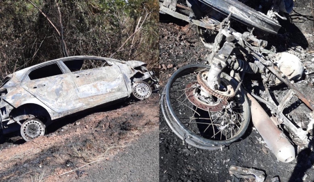 Após a colisão, os dois veículos envolvidos no acidente pegaram fogo às margens da rodovia.