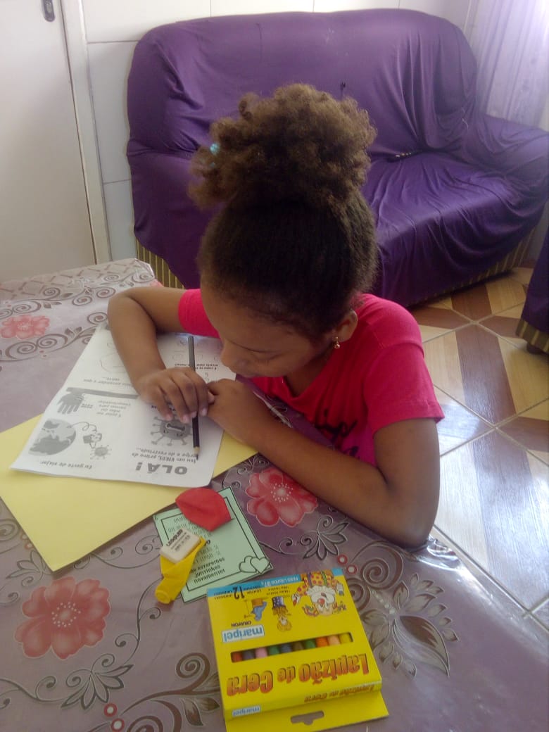 Ana Vitória Amorim tem 9 anos e gostou muito de receber as atividades em casa: “As atividades são muito legais, antes não tinha nada para fazer, só brincava, agora tenho as atividades para ajudar passar o tempo e diminuir as saudades da LBV.”