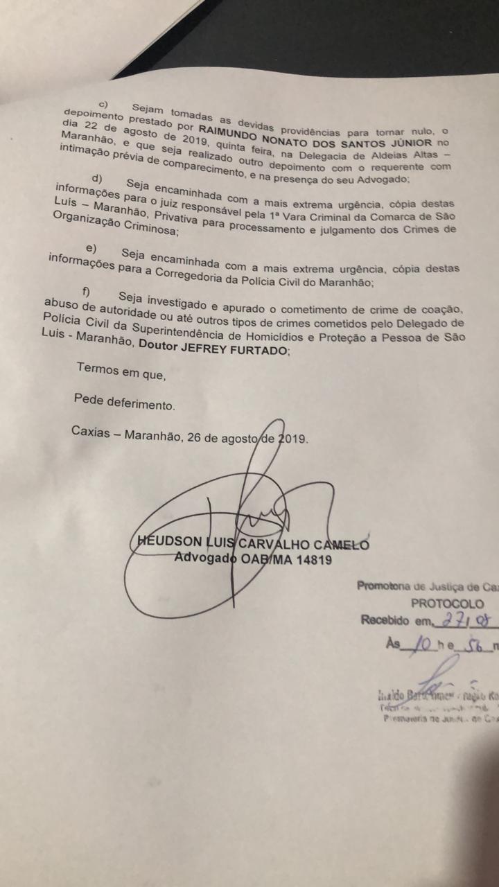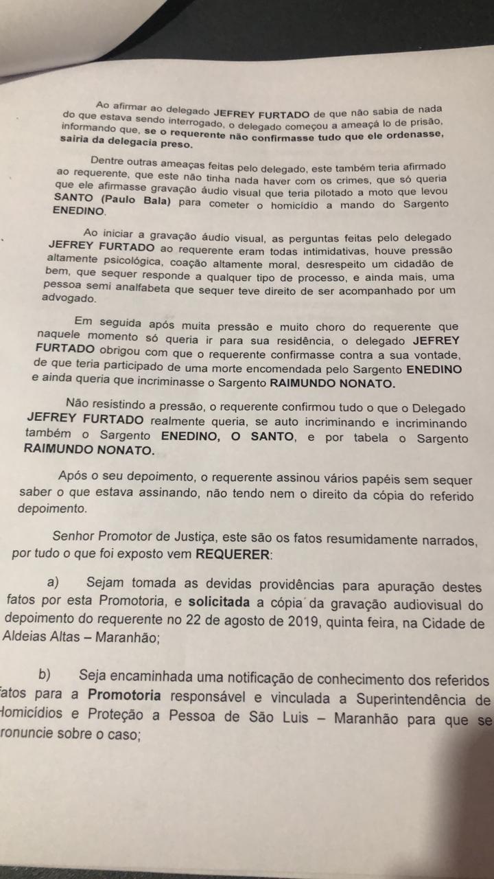 A liberdade da policial aconteceu justamente, após a apresentação espontânea de Santo da Conceição Silva, pistoleiro, onde o mesmo prestou um depoimento bombástico em um cartório de São Luís, o qual acusou um outro pistoleiro conhecido por “Zaqueu” de orquestrar tudo a mando do político de Aldeias Altas, identificado por Kedson de Araújo Lima, do PC do B de Aldeias Altas, onde este disputou as últimas eleições a prefeito e perdeu o pleito para o atual gestor daquela cidade.