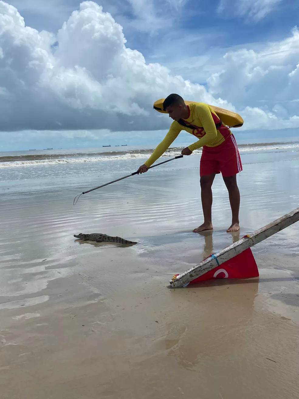 Um filhote de jacaré foi flagrado na manhã deste domingo (20) na beira do mar da Praia do Calhau, situada em São Luís. O animal chamou a atenção dos banhistas que estavam no local.