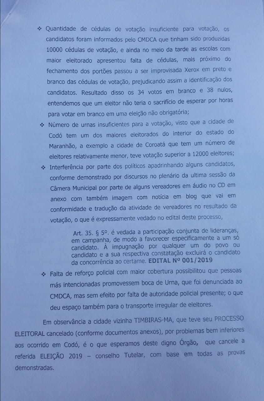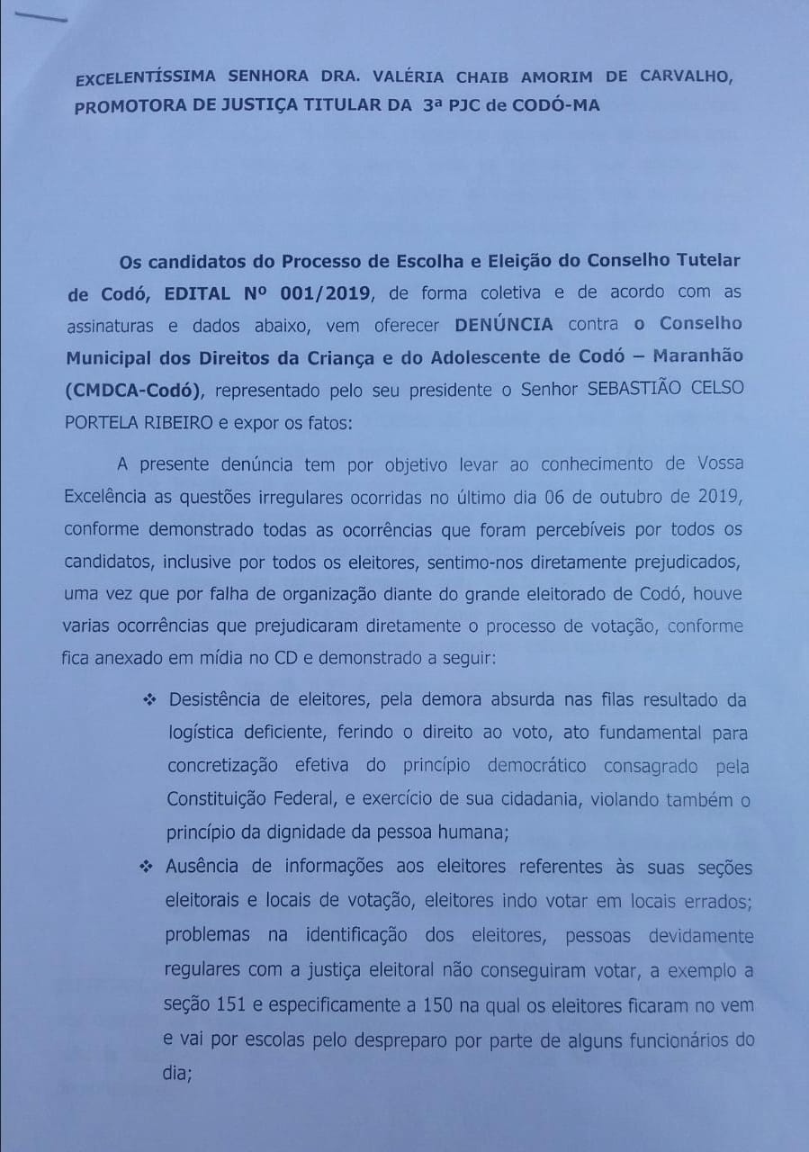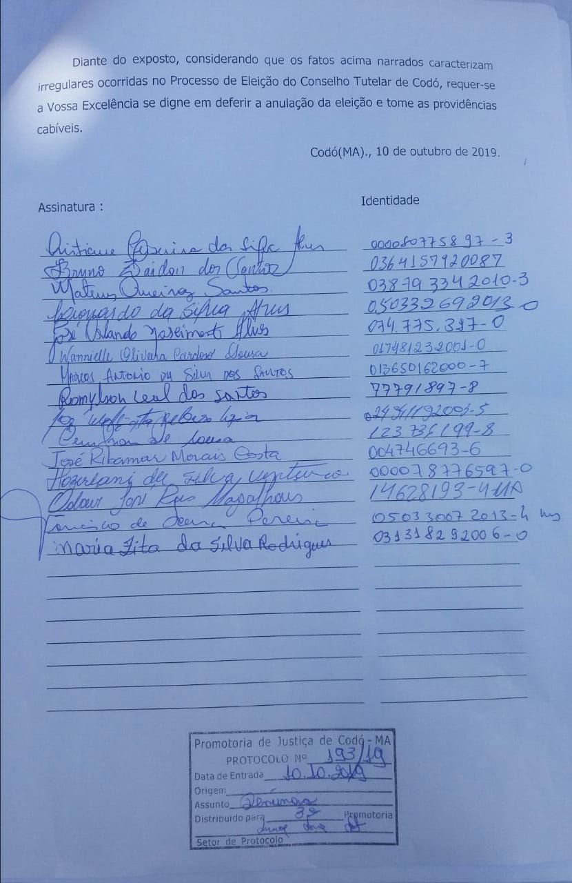 Um grupo de candidatos que disputou a eleição do Conselho Tutelar de Codó, realizada no último domingo (06), protocolou no Ministério Público um pedido de anulação do processo que escolheu as conselheiras do município para o quadriênio 2020/2023.