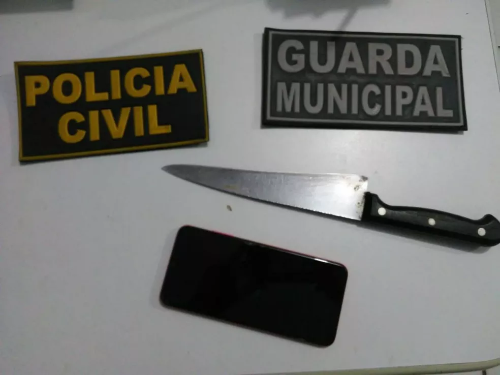 O agressor foi capturado em via pública, bairro Centro, da Cidade Balneária, sendo recuperado o celular da vítima e apreendida a arma branca usada para ameaçar a mulher.