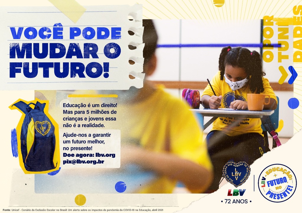 Diante de tantos desafios, a Legião da Boa Vontade (LBV) inicia mais uma importante mobilização social em apoio à educação brasileira. Intitulada “LBV — Educação: Futuro no Presente!”, a iniciativa visa angariar doações e entregar no começo do ano letivo 20 mil kits de material pedagógico para crianças, adolescentes e jovens atendidos pela Instituição e também por organizações parceiras no país.