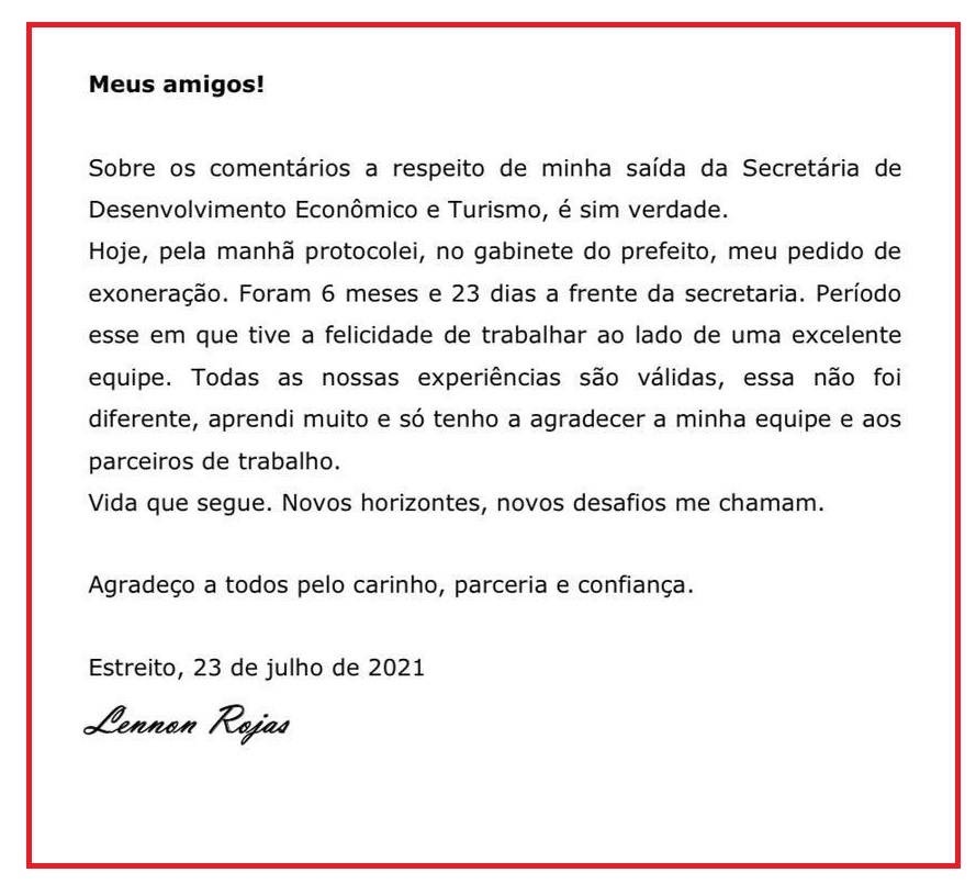 No mesmo dia que Lorraine deixou a secretária de Saúde, outro secretário anunciou a sua saída através de uma nota pública. Trata-se de Lenno Rojas, que ocupava o cargo de secretário de Desenvolvimento e Turismo.