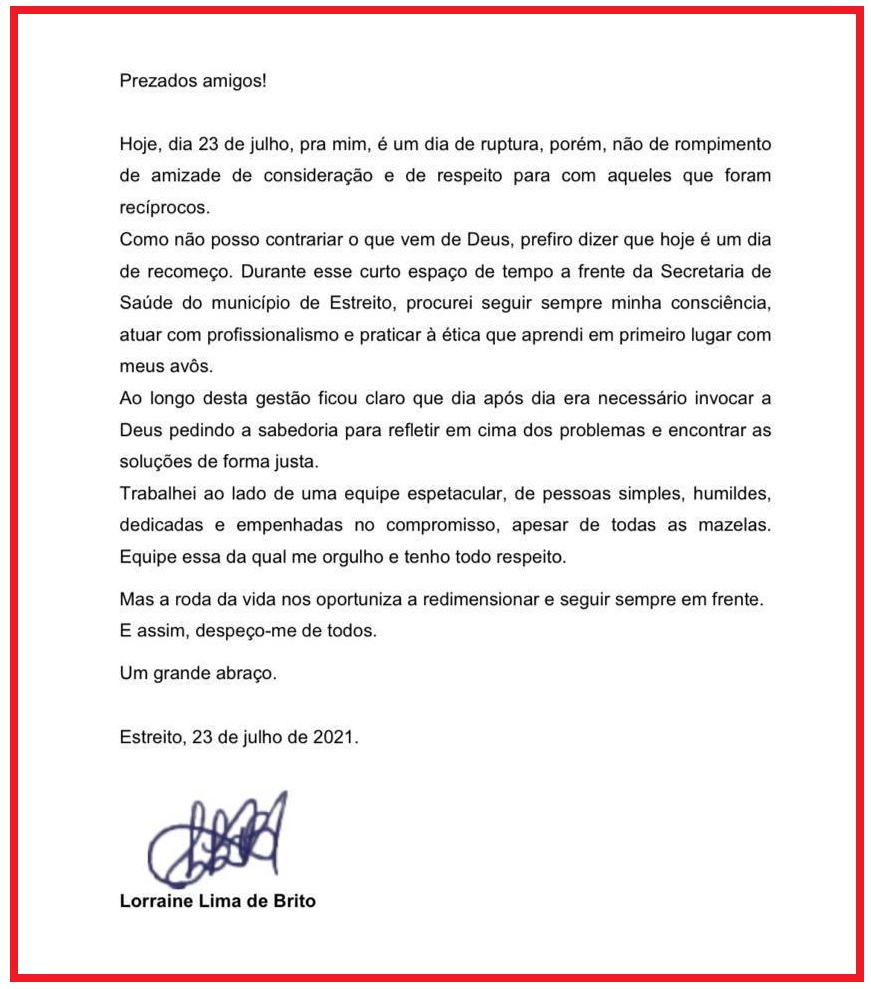 A primeira que anunciou sua saída, foi a secretária de Saúde do município, Lorraine Lima de Brito. Por meio de uma nota, a secretária despediu-se dos colegas e amigos, que fez ao logo do curto período que ficou à frente da Saúde. Antes de Lorraine, a Secretaria de Saúde de Estreito, era ocupada pelo ex-candidato a vereador, Claudiney, que também anunciou a sua saída, ainda no início da gestão.