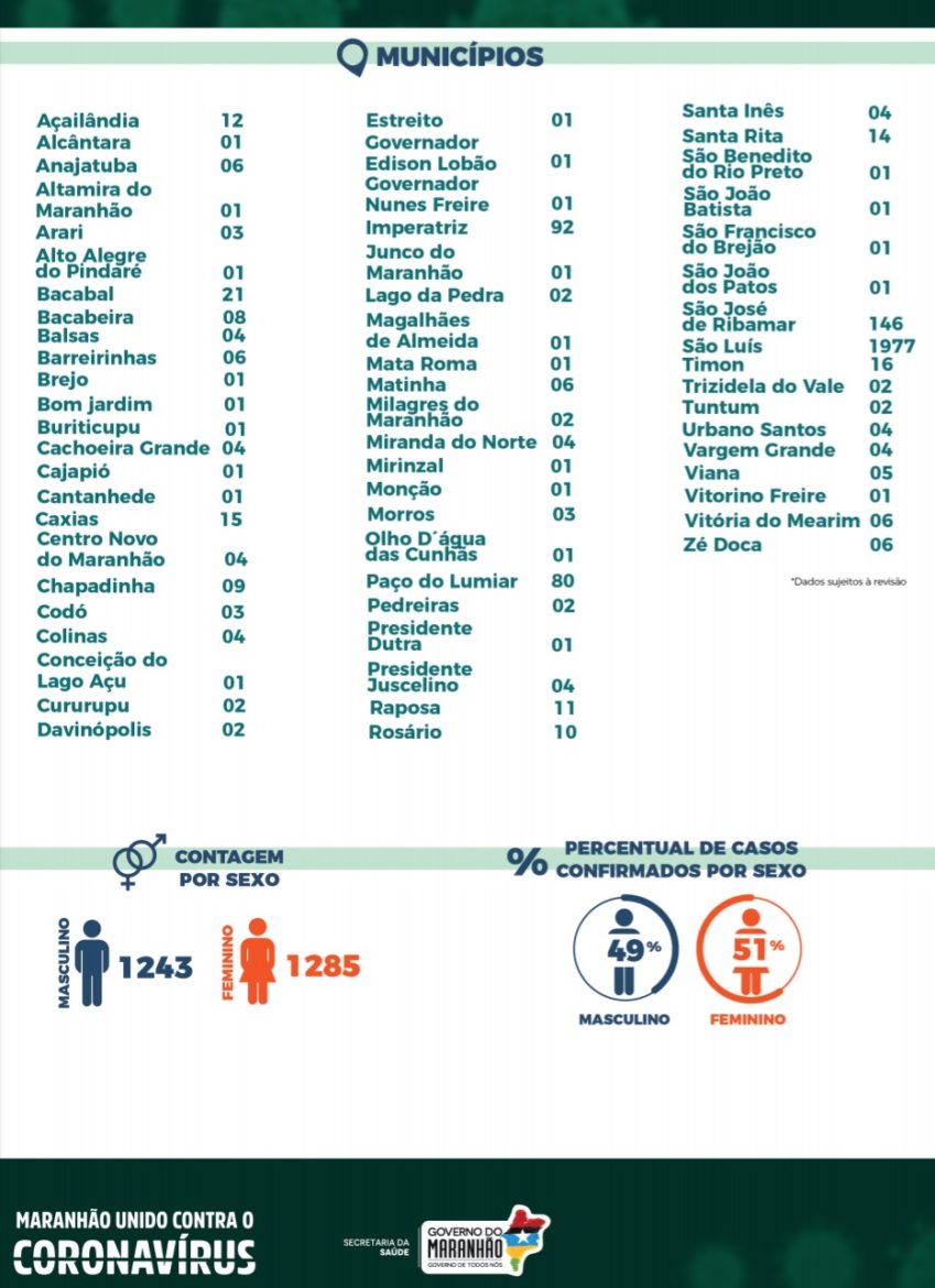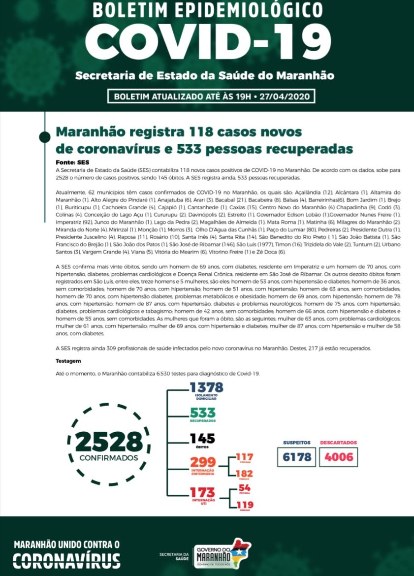 O boletim diário da Secretaria de Estado da Saúde (SES), divulgado às 20h desta segunda-feira (27), mostra que o Maranhão já possui 2528 casos do novo coronavírus. 62 municípios maranhenses apresentaram registros da doença. O documento também mostra que 145 pessoas já morreram em decorrência do Covid-19 no estado.