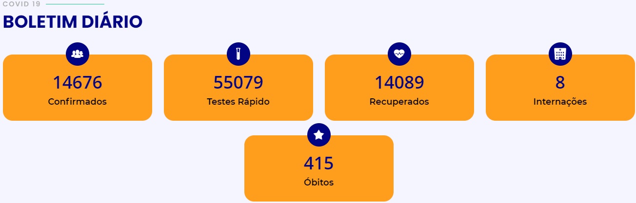 Ao todo, são 14.676 casos positivos e 14.089 recuperados desde o início da pandemia. Dos confirmados, 8 pacientes estão em internação hospitalar.