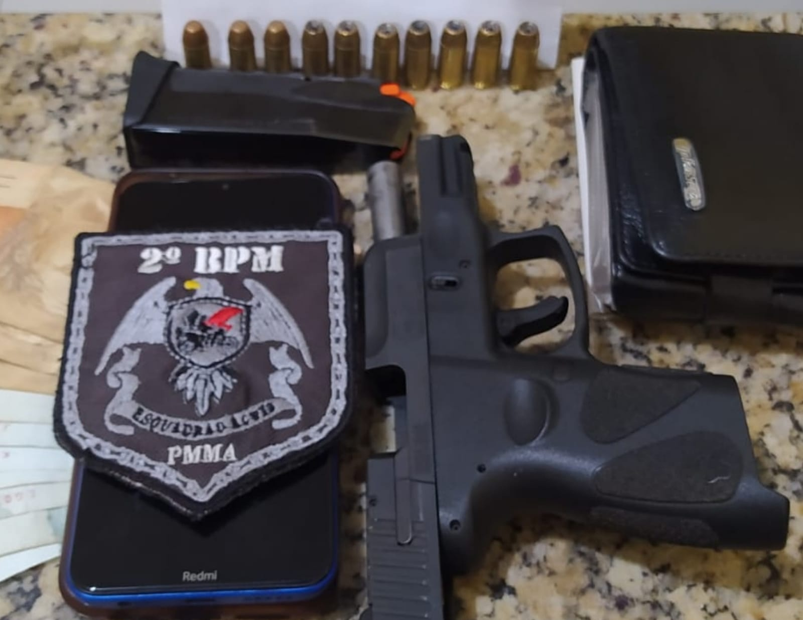 Realizada a abordagem nos dois suspeitos que estavam no interior do veículo, sendo um homem de 36 anos e outro de 21 anos, foram encontrados uma pistola e 10 munições intactas, além de outros materiais, como celulares e uma quantia de R$ 850,00 em cédulas trocadas.