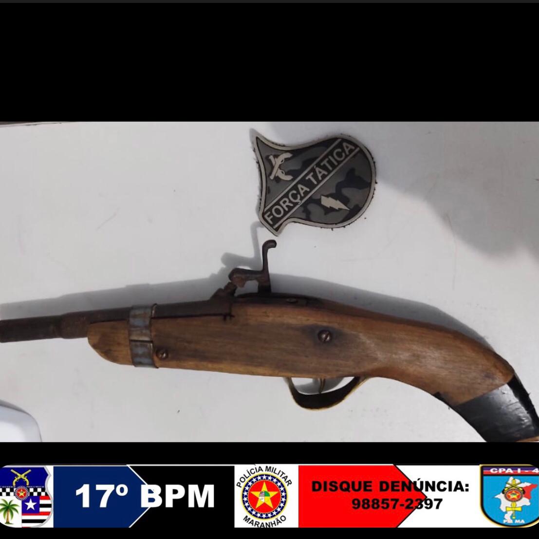 No local, a equipe visualizou um indivíduo em atitude suspeita e ao ser realizada a abordagem foi encontrada uma arma de fogo de fabricação caseira (garrucha).