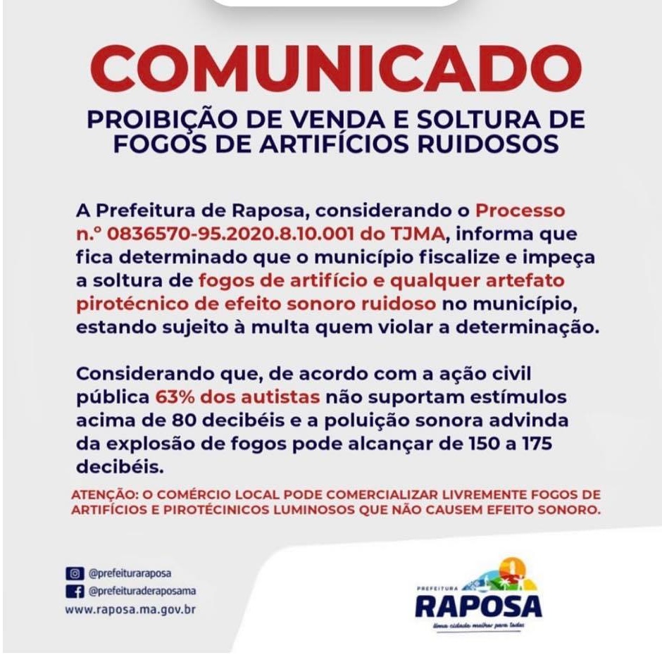 A Prefeitura de Raposa por meio de um “comunicado” em suas redes sociais informou esta semana a população local que está proibida a soltura de qualquer tipo de fogos de artifícios que emitem barulho.