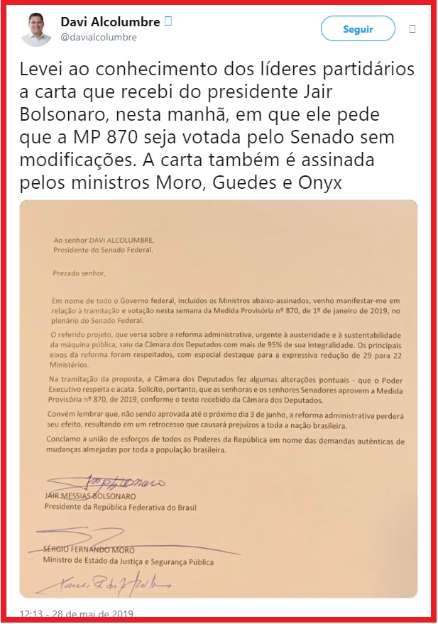 A preocupação fez com que Bolsonaro enviasse uma carta aos senadores pedindo a aprovação da proposta na forma com que ela saiu da Câmara. O documento foi assinado por Bolsonaro e pelos ministros Sérgio Moro (Justiça), Paulo Guedes (Economia) e Onyx Lorenzoni (Casa Civil).