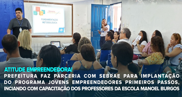 ATITUDE EMPREENDEDORA – Prefeitura faz parceria com SEBRAE para implantação do programa Jovem Empreendedores primeiros passos, iniciando com capacitação dos professores da Escola Manoel Burgos.