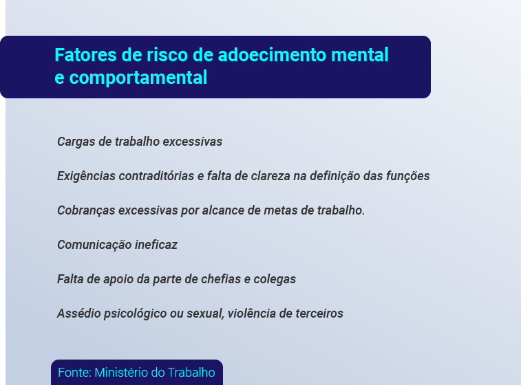 Segundo a gerente da instituição, Letícia Lessa, transtornos mentais e comportamentais já estão no topo das doenças que mais afastam do trabalho e precisam tanto de prevenção quanto do gerenciamento dos riscos. “Hoje, nós temos várias soluções desenvolvidas em parceria com a indústria para identificar, inicialmente, quais são esses fatores de risco apresentados na sua realidade, nesse contexto do trabalho e a partir da identificação desses riscos, como fazer um melhor gerenciamento deles”, afirma.